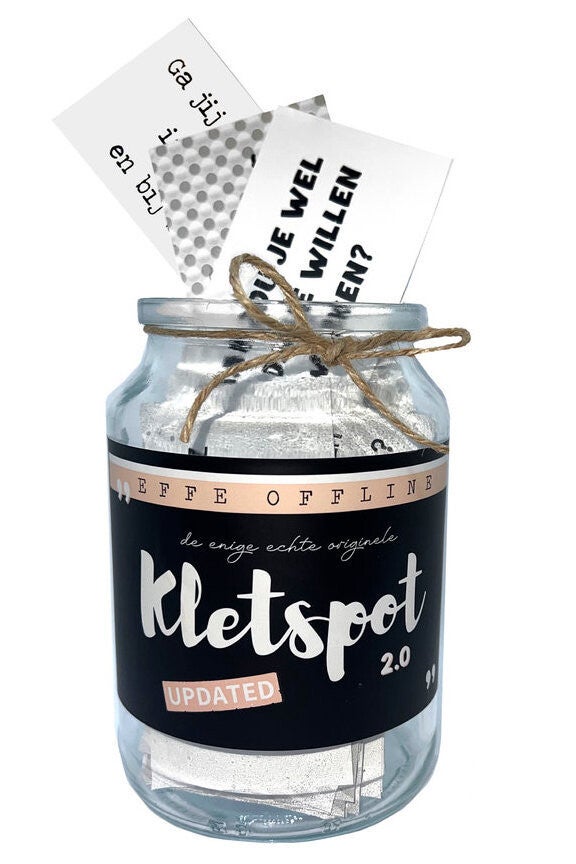 Kletsen 2.0. Deze nieuwe versie van de Originele Kletspot zorgt voor hilarische lachmomenten met vrienden, familie en visite. De pot zit boordevol nieuwe grappige vragen, leuke suggesties en dilemma's die zorgen voor diepgaande en lachwekkende gesprekken. Met deze 200 kletsvragen is dit spel een must-have voor iedereen die van gezelligheid houdt. De Kletspot is een gezelschapsspel zonder spelregels en is daardoor geschikt voor jong en oud. Het formaat van de pot is 17 cm Ø 9,5cm en is een eye-catcher op elke tafel. Geef de Originele Kletspot cadeau aan jezelf, vrienden, familie of als relatiegeschenk en maak iedereen blij met dit originele en waanzinnige spel. Geschikt voor alle leeftijden. Let op. De eerste ervaringen en reviews zijn overweldigend!