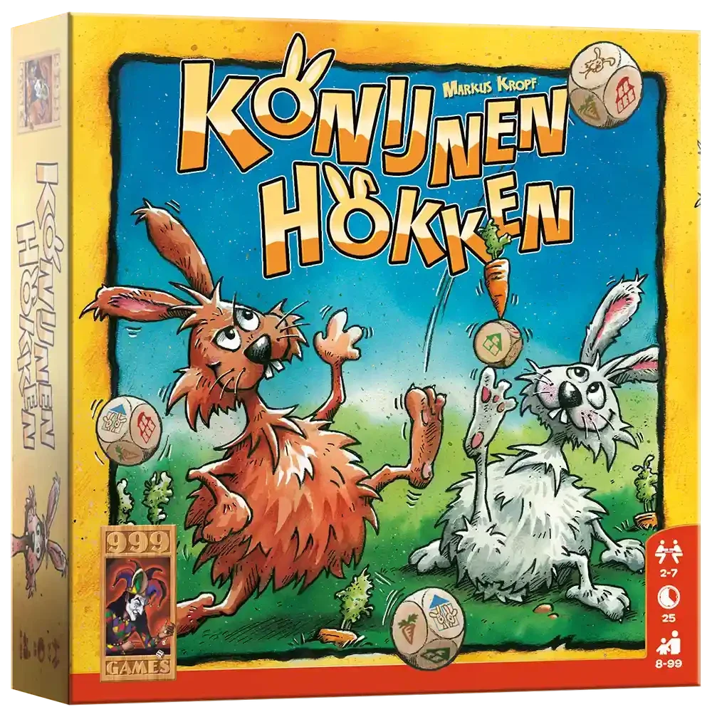 Dobbelspel voor echte waaghalzen. Verzamel zoveel mogelijk konijnen en hokken. Als je stopt, scoor je punten. Maar doe dat niet te vroeg, want de volgende speler mag met jouw score verdergaan! Vlot, zenuwslopend dobbelspel, waarin een speler zowel konijnen als hokken moet dobbelen om punten te scoren. Zolang hij de juiste symbolen gooit, mag hij doorgaan. Als het risico hem te groot wordt, mag hij stoppen en punten schrijven. Als je aan de beurt bent, gooi je met de dobbelstenen en moet je ten minste een konijn opzij leggen. Verder kun je hokken opzij leggen, maar dat moet je in oplopende volgorde doen. Wortels moet je ook wegleggen, maar die mag je niet opnieuw gooien. Daarna gooi je niet opzij gelegde dobbelstenen opnieuw. Zo ga je door totdat je niet meer verder kunt of wilt. Kun je na een worp geen konijnen opzij leggen, dan scoor je geen punten. Als je besluit te stoppen, scoor je het aantal geworpen konijnen vermenigvuldigd met het niveau van je hokken. Daarna is de volgende speler aan de beurt. Die mag er echter voor kiezen om het risico wel te nemen en door te spelen met het aantal punten dat jij hebt geschreven. Hoor jij bij de durfals of neem je liever het zekere voor het onzekere? Konijnen Hokken past uitstekend in onze serie dobbelspellen en is ideaal voor op vakantie. Er kunnen maar liefst 7 spelers meedoen! Inhoud: 7 dobbelstenen 1 Markeerbord 2 Markeerstenen 1 Scoreblok spelregels